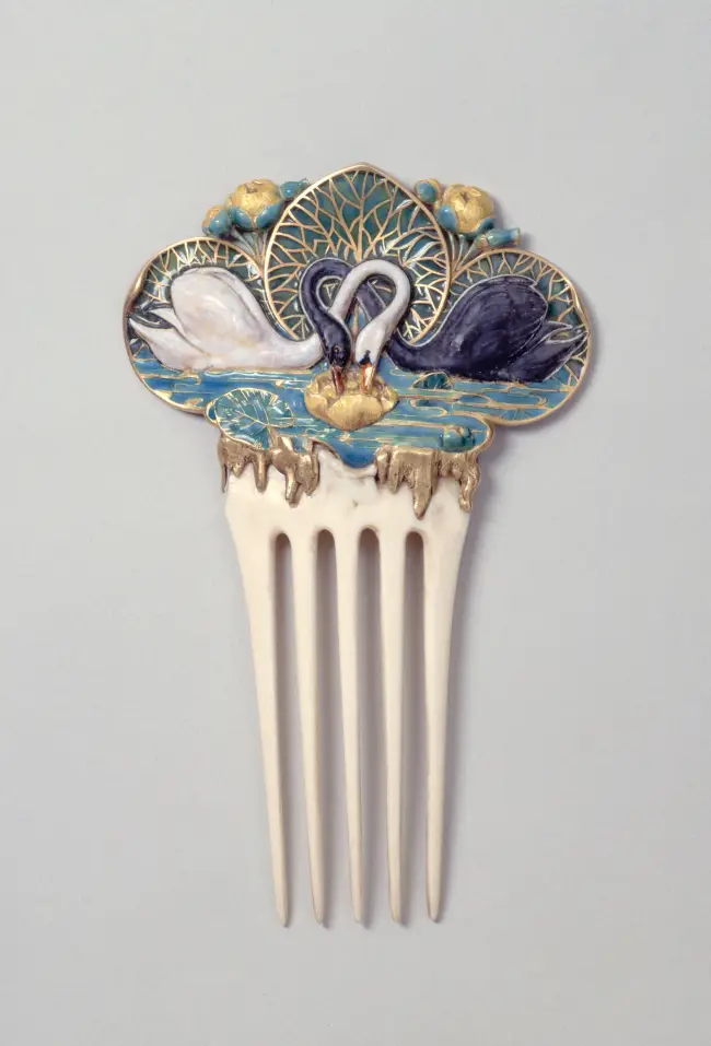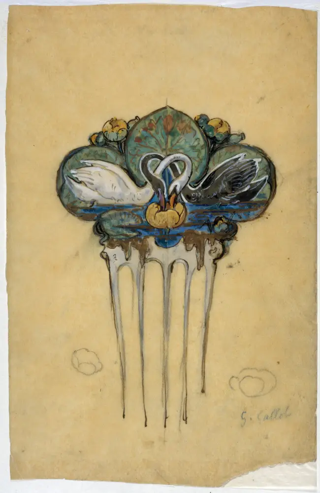 Na primeira seção, o visitante encontrava estudos minuciosos da natureza, que inspiraram obras como um pente baseado em um modelo de Eugène Grasset (1845-1917), representando cisnes e nenúfares. Embora o desenho preparatório original tenha se perdido, um outro estudo ainda sobrevive e foi exibido na exposição. O pente, feito de marfim, ouro e esmalte, revela a união entre observação científica da natureza e imaginação onírica, comum a muitos artistas da mostra, como o próprio René Lalique, que transitava entre a joalheria e outras artes decorativas.