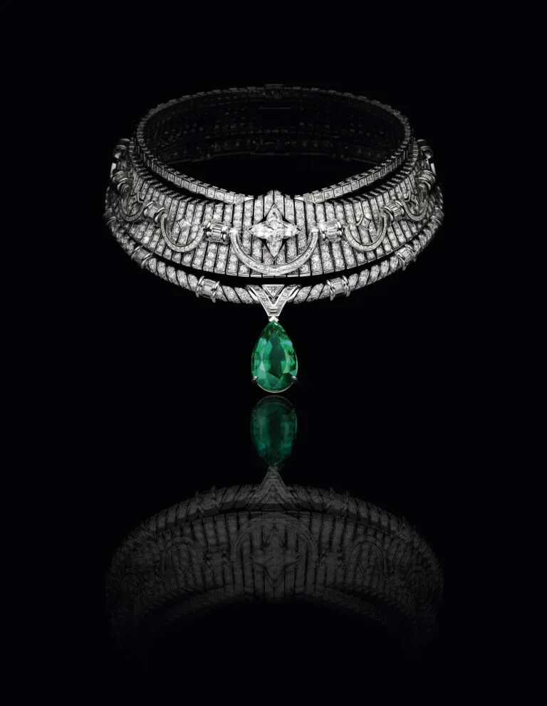 À medida que a coleção evolui através das coleções Maestria e Monumental, a expertise da Louis Vuitton atinge novos patamares. O colar Maestria – uma obra-prima geométrica cravejada com três vibrantes esmeraldas colombianas e 2.500 diamantes – é um feito impressionante de precisão, enquanto as peças Monumental, adornadas com 320 pedras, incluindo esmeraldas, rubis e diamantes, exibem o delicado equilíbrio entre estrutura e leveza. Mas o verdadeiro ápice da maestria é alcançado na coleção Apogée, tendo como protagonista a esmeralda brasileira de 30,75 quilates em lapidação gota, emoldurada por alças cravejadas de diamantes inspiradas nos icônicos baús da maison, coroa o brilhantismo técnico da coleção.
