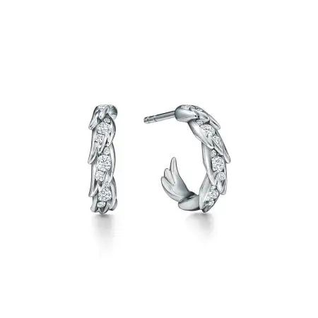As interpretações mais abstratas da coleção de joias finas – Bird on a Rock by Tiffany Wings – mostram diamantes com engastes ocultos, como se estivessem suspensos no ar. Quando empilhadas, as bordas recortadas de uma peça encaixam-se perfeitamente na silhueta em forma de pena da outra. Um estilo chave, um par de brincos convertíveis, oferece quatro visuais diferentes, desde brincos de gota marcantes a tachas delicadas.