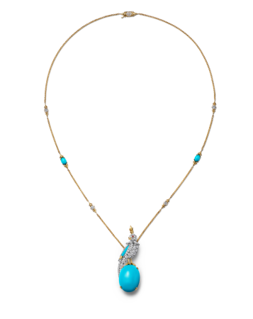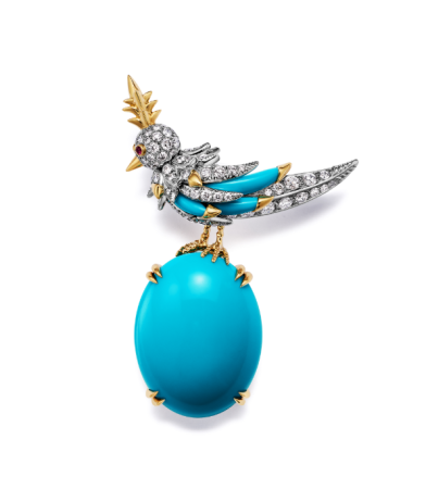 O conjunto tanzanite apresenta um colar, uma pulseira e brincos impressionantes. O conjunto turquesa é ancorado por um colar de afirmação com um pássaro de diamantes que parece agarrar fios de turquesa cabochão, acentuado com penas de ouro e diamantes. A peça culmina numa dramática gota de turquesa cabochão. O conjunto também inclui um pendente, um broche e um anel, cada um deles fazendo eco do pássaro icónico de formas inesperadas.