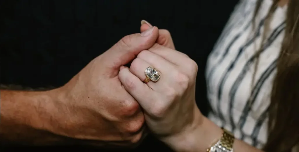 Com um diamante “old mine cushion cut” de proporções generosas — estimado entre 7 e 10 quilates, avaliado em US$ 1 milhão — o anel engastado em ouro amarelo e com detalhes gravados à mão tem um design que mistura um certo ar de herança familiar ao minimalismo contemporâneo, mas, principalmente retoma cortes antigos, em que cada diamante é lapidado à mão, irradia uma luz mais suave e menos chamativa que os brilhos industriais modernos.